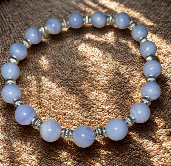 - Silver-Toned Etched Spacers: These intricately designed spacers add a touch of elegance and sophistication to the bracelet. The etched details enhance the overall aesthetic while providing a visual contrast to the smooth energy of the Blue Lace Agate. They create a perfect balance between style and serenity, making this design both striking and harmonious.